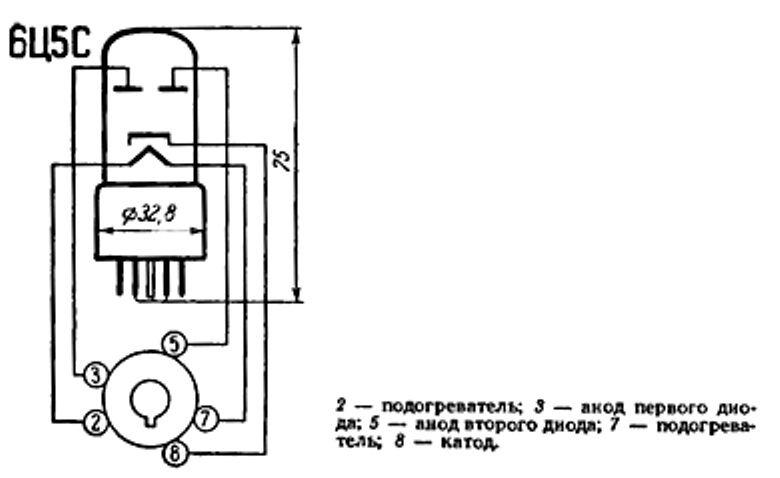 6Ц5С кенотрон двуханодный с общим катодом косвенного накала - предназначен для выпрямления переменного напряжения тока промышленной частоты, относится к разделу электровакуумных приборов и ламп различного назначения. По конструкции состоит из вакуумно-герметичной, жесткой оболочки, внутри которой отсутствует кислород.